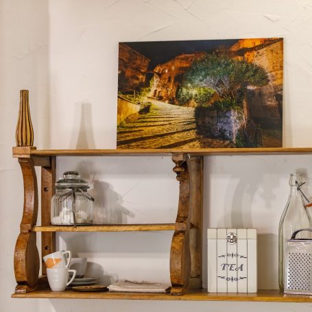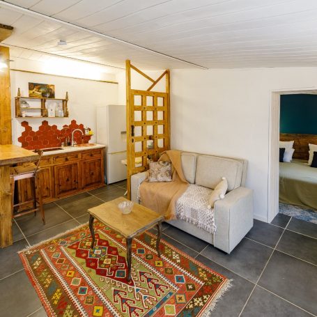 Elle possède un lit king size en 180cm x 190cm, d'un placard avec penderie et étagères un canapé transformable en lit une personne.